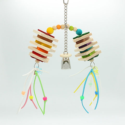 木や紐に触れて遊ぶと、ケージ内で優しいカウベルの音が響きます。