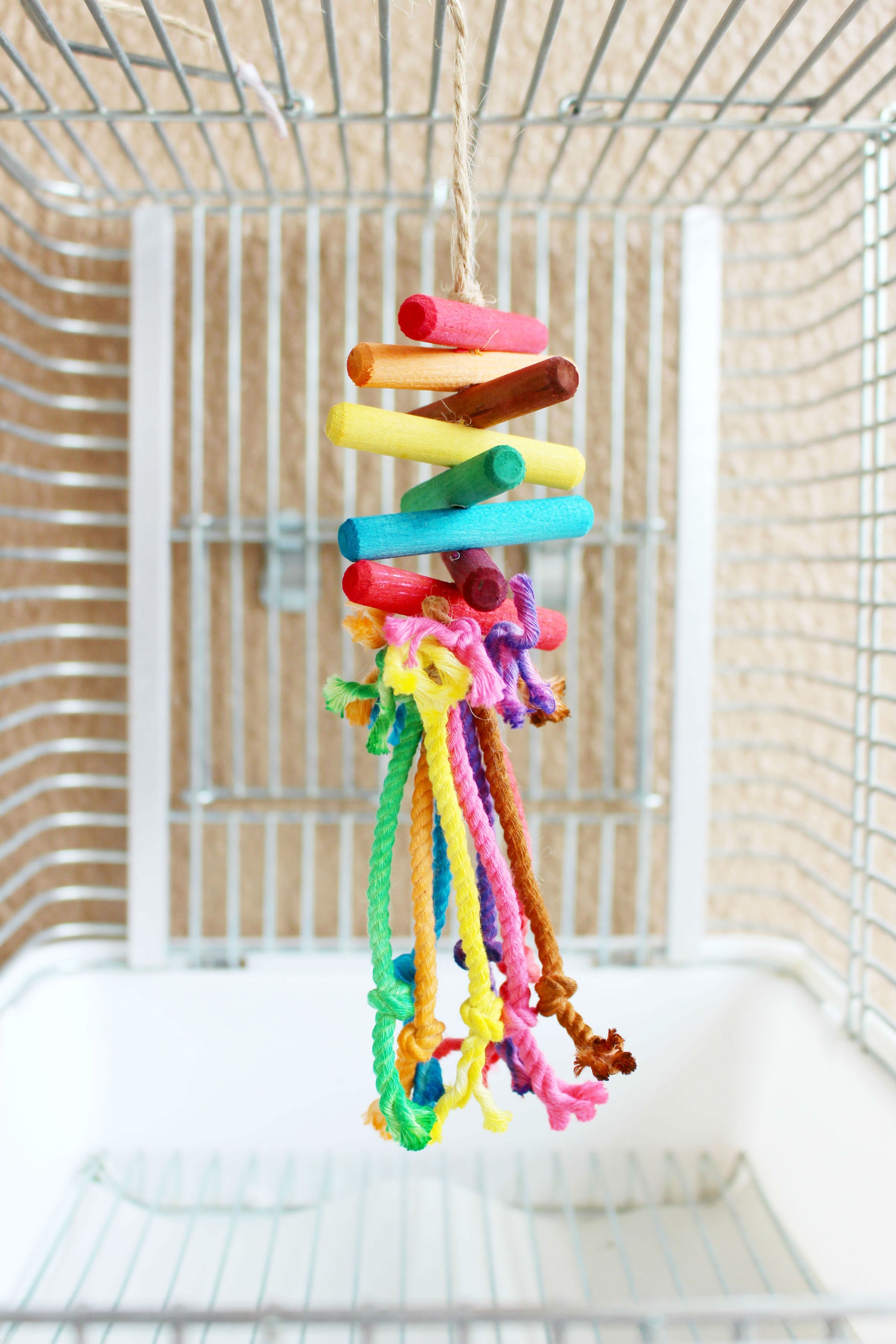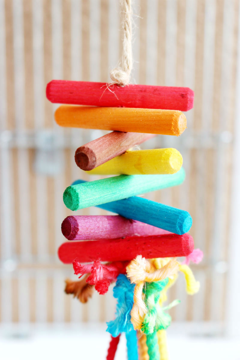 ハンドメイドの小型〜中型の小鳥さん用のカラフルなおもちゃです。
