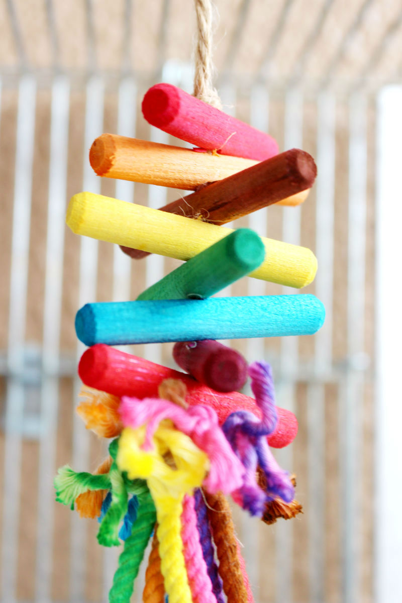 シンプルな作りながら、噛んでも遊んでも楽しく作りました。 好奇心旺盛な盛なインコちゃん、紐をカミカミ噛んで遊ぶのが好きな鳥さんオススメ