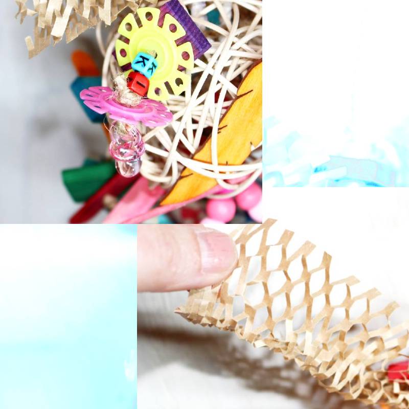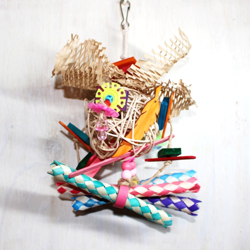 大きなおもちゃとなりますので、噛んで遊ぶのが好きな鳥(ウロコインコ・オキナインコ、シロハラインコやメキシコインコくらいのサイズ)大型インコの(比較的小柄なモモイロインコさんサイズ)の鳥さんは、楽しく遊べると思います。