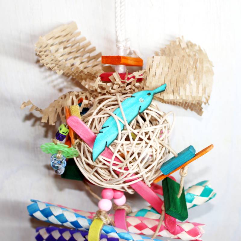 約8cmのハンドメイドの特大マンチボールから、バンブーシュレッダーがぶら下がり、 揺らしても、噛んで壊しても楽しく遊べるおもちゃです。