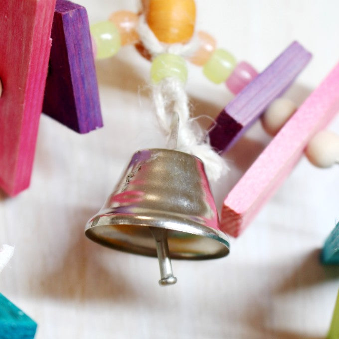 鳥さんが大好きなベル(※1)をつけて、かじるだけではなく楽しく遊べるようにしました。