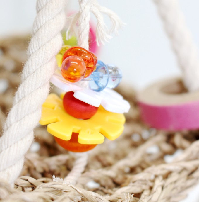 (花形おもちゃはロープの結び目をほどき、カウベルは金具(フック)から着脱可)