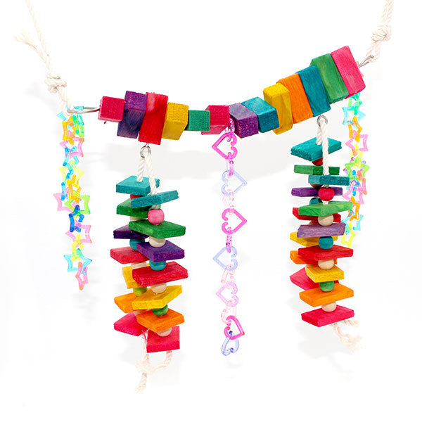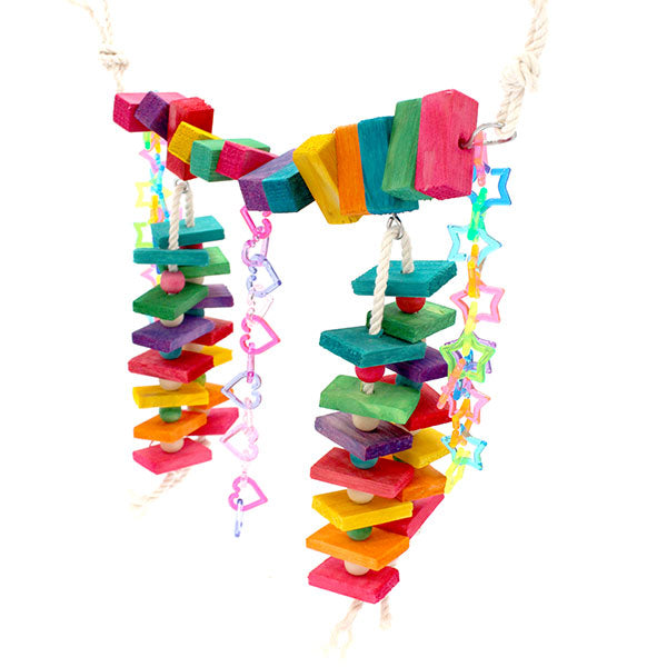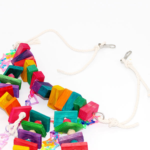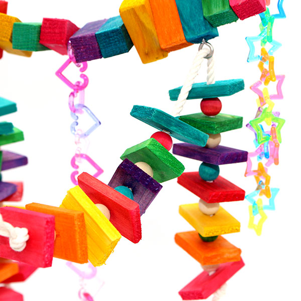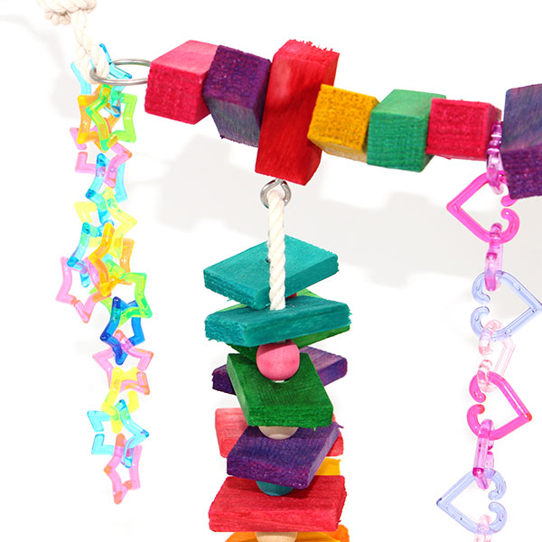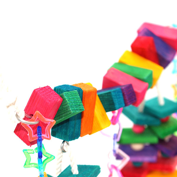 こちらは、中型インコ向けのレインボーカラーの鳥のおもちゃです。