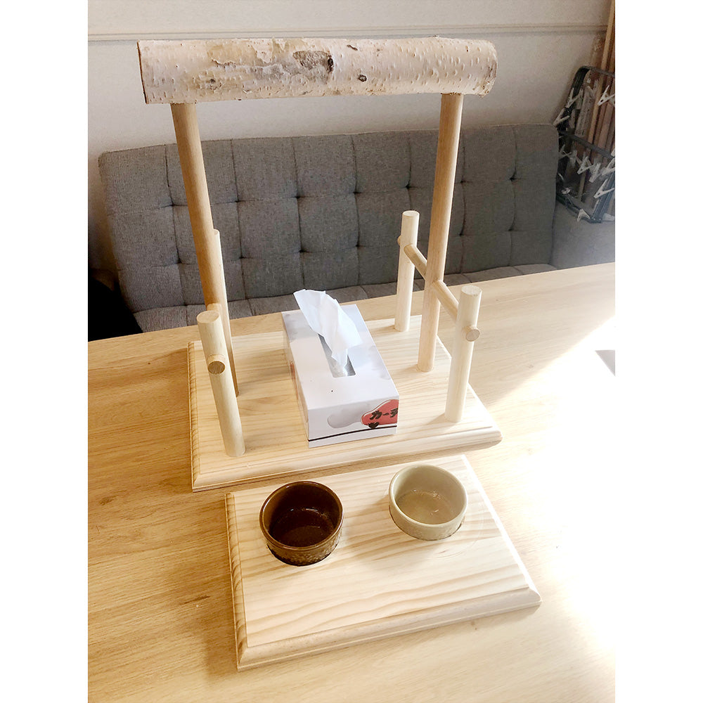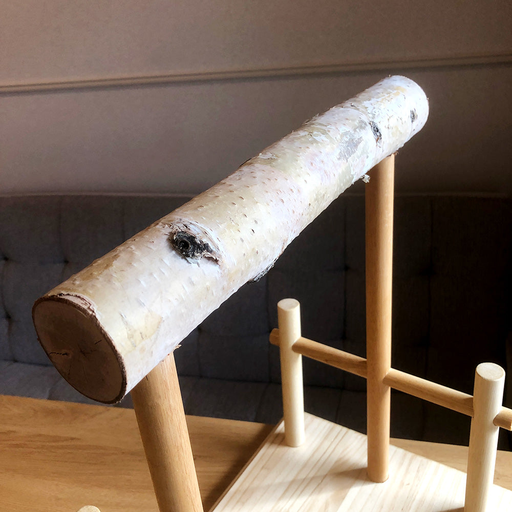 こちらは、大型インコ向け「足場付き」白樺止まり木スタンドです。