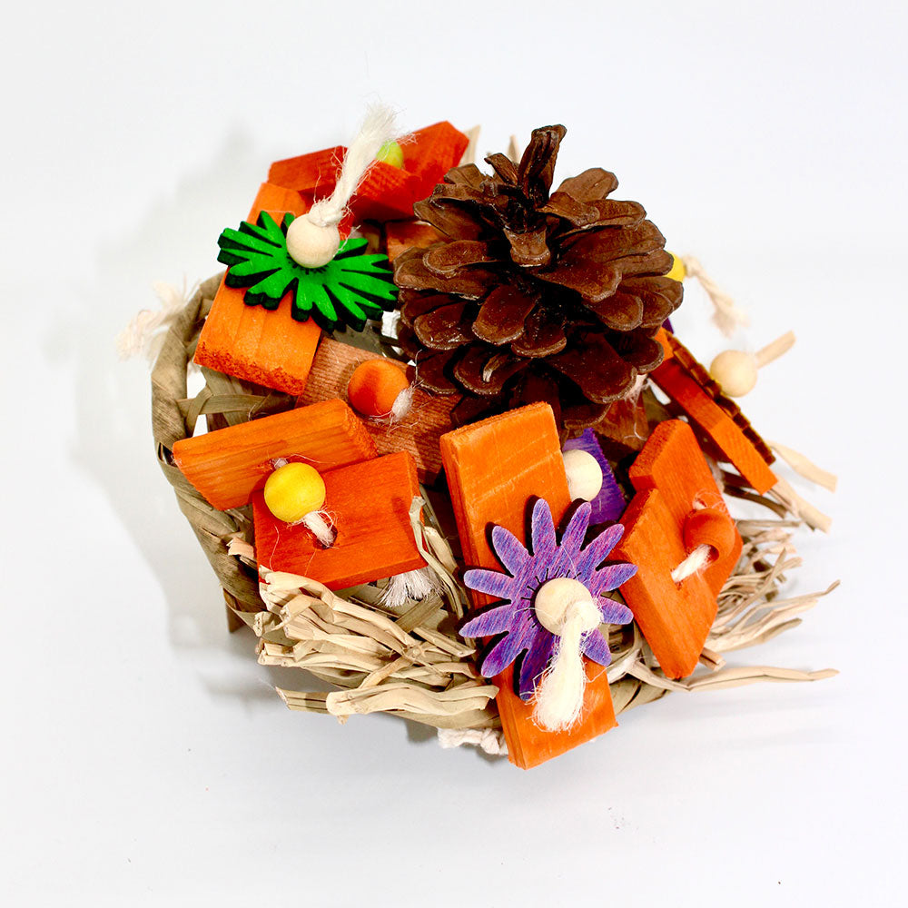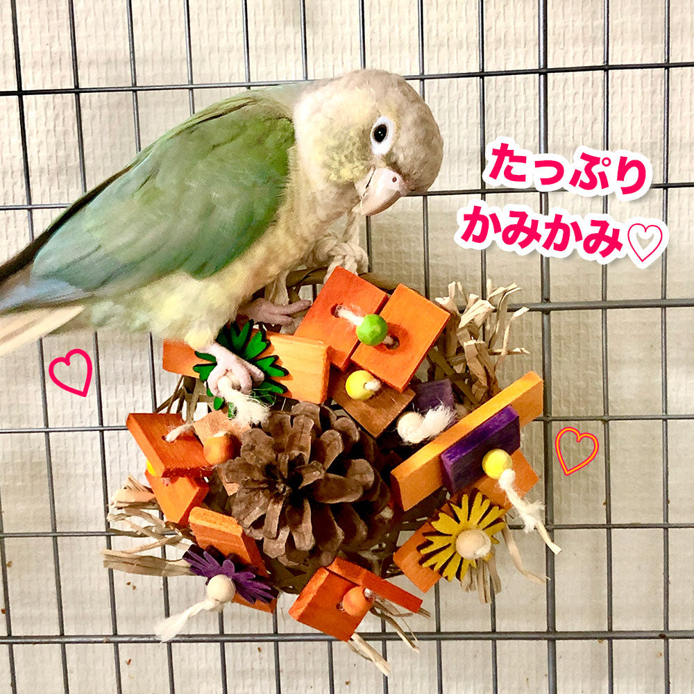 元気なインコさんなら、乗っかって上から横からケーキをカミカミ楽しめるおもちゃとなっております。